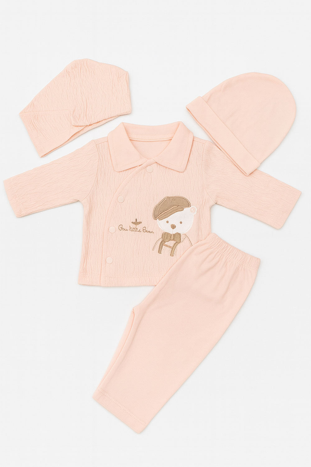 Charming newborn outfit in a delicate pink blossom shade, made from soft, breathable fabric for all-day comfort. Perfect for special occasions or everyday wear.